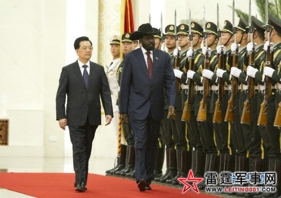 4月24日,中国国家主席胡锦涛在北京人民大会堂欢迎南苏丹总统萨尔瓦·基尔访华。